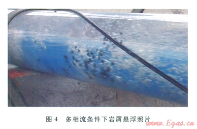 懸浮是巖屑顆粒運動的重要方式,引起巖屑顆粒懸浮的主要因素是紊動作用(圖3)。懸浮運動的形式是隨鉆井液漂流,懸浮運動時受到2種力的作用:①重力,使巖屑顆粒向下井壁沉降;②氣液兩相流推動力,使巖屑顆粒沿井筒向下游運動。巖屑顆粒向下游運動的速度與氣液兩相流速度有關(guān),巖屑顆粒輸送量可間接代表巖屑顆粒向下游運動的速度,流量越大,可帶走的巖屑顆粒量也越多。懸浮顆粒在沉降過程中被渦流帶回上層,使巖屑顆粒上下漂移,沉降速度變慢,巖屑懸浮照片如圖4所示。
