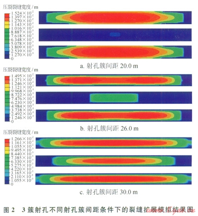筆者模擬了2簇、3簇和4簇射孔在不同的射孔簇間距條件下的裂縫擴展,圖2所示為3簇射孔、不同的射孔簇間距條件下的擴展結果,圖2-a為射孔簇間距為20.0m時的裂縫擴展結果,中間的射孔簇只能開啟小段距離后就發(fā)生止裂,不能形成有效裂縫;圖2-b所示的為射孔簇間距為26.0m時的裂縫寬度圖,中間的射孔簇產生的壓裂裂縫能擴展一段距離,但是裂縫的艮度有限,不到兩端射孔壓裂裂縫的一半;圖2-c所示的是射孔簇間距為30.0m時的裂縫擴展結果,中間的裂縫長度只比兩端的裂縫略短,形成了有效裂縫。