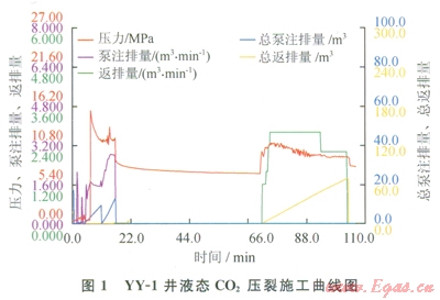YY-1井井深l600m,長(zhǎng)7段巖性為黑色頁(yè)巖,厚度65m,錄井氣測(cè)異常,具有較好的試氣價(jià)值。2012年4月,采用液態(tài)CO2壓裂工藝對(duì)該井長(zhǎng)7段頁(yè)巖氣層進(jìn)行壓裂,有明顯破壓顯示,施工壓力平穩(wěn)(圖1),施工順利。關(guān)井24h后開井放噴排液,24h后點(diǎn)火可燃。
