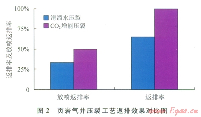 從圖2可以看出,采用CO2增能壓裂后,頁(yè)巖氣井的壓裂液放噴返排率提高了17%、最終返排率提高35%,同時(shí)排液周期從之前的平均45d縮短到25d左右,效果非常明顯。