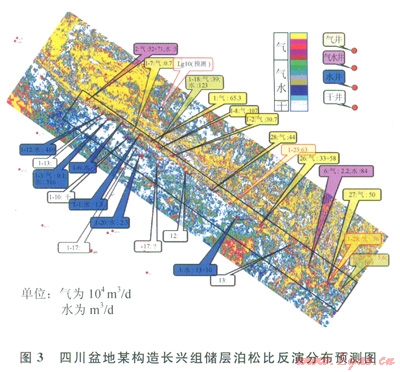 由此建立的氣水預(yù)測(cè)模型具有普適性(圖2)。圖2表示含氣層、氣水層、水層、巖石(碳酸鹽巖)的泊松比分布范圍,是依次升高的,具體到某個(gè)儲(chǔ)層時(shí),其值略有不同。依據(jù)此模型,即可對(duì)預(yù)測(cè)的結(jié)果進(jìn)行氣水預(yù)測(cè)解釋。