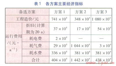 按照各方案的系統(tǒng)設(shè)備組成估算造價(jià),同時(shí)結(jié)合各方案的運(yùn)行要求,測算年水、電、氣的消耗費(fèi)用。各方案主要經(jīng)濟(jì)指標(biāo)見表1。
