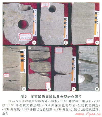 崖城l3-1氣田的其他鉆井具有同樣的沉積特征(圖3-c、3-d、3-e),與SS4井緊鄰的SS5井崖三段也有類似特點(圖3-f)。位于SS5井南部的SS6井崖三段下部為灰白色砂巖夾灰色、深灰色泥巖,往上為灰白色砂巖與灰色泥巖的互層,見清晰的反映潮汐作用的透鏡狀層理、脈狀層理與波狀層理(圖3-g),蟲孔發(fā)育,代表水體加深、受潮汐影響變強,該部位主要的成煤環(huán)境為潮坪的潮上帶。而位于崖南凹陷南部崖南低凸起的SS7井,其崖城組下部以淺灰色粗砂巖夾薄層灰黑色泥巖為主,上部為深灰色泥巖夾薄層淺灰色細砂巖或兩者的互層,見豐度不等的有孔蟲、鈣質(zhì)超微化石,有孔蟲以近岸底棲種群為主,主要粒徑大于0.125mm,早期浮游有孔蟲也具較高濃度,豐度為30~400枚/50g,并伴有少量共生的淺海介形蟲,見粒面球藻、瘤面球藻、褶皺藻等孢粉化石,反映沉積時期為濱海或受限的淺海環(huán)境,主要的烴源巖形成環(huán)境為淺海。