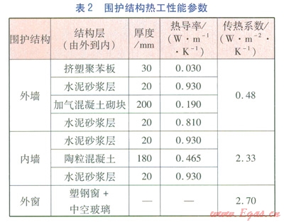 以天津市某住宅小區(qū)建筑為例,該建筑為一梯兩戶的l5層板樓,層高為3m。典型層的房間平面布置見圖1,東側(cè)住戶建筑面積為l33.03m2,西側(cè)住戶建筑面積為132.07m2。各房間及外窗尺寸見表1,圍護(hù)結(jié)構(gòu)熱工性能參數(shù)見表2。