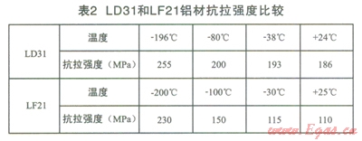 常見(jiàn)的氣化器材質(zhì)一般為LF21(美國(guó)牌號(hào)為3003)和LD31(美國(guó)牌號(hào)為6063),鋁合金LD31材質(zhì)從+24℃~-196℃強(qiáng)度相近,在常溫與低溫時(shí),主體結(jié)構(gòu)應(yīng)力均衡、抗拉強(qiáng)度也是均衡的。而LF2l在常溫與低溫時(shí),從+25℃~-200℃強(qiáng)度相差懸殊近l倍,抗拉強(qiáng)度相差較大,力學(xué)的差異也較大,具體抗拉強(qiáng)度參數(shù)見(jiàn)表2。在冷熱交替頻繁時(shí)容易造成金屬疲勞現(xiàn)象,而導(dǎo)致較易出現(xiàn)裂縫。但是LD31鋁材的抗氧化性能低于LF21鋁材,所以LD31鋁材需要進(jìn)行抗氧化防護(hù)。氣化器材質(zhì)宜選用LD31鋁型材。對(duì)于相同長(zhǎng)度的換熱翅片管,顯然翅片管管徑大的氣化量大。