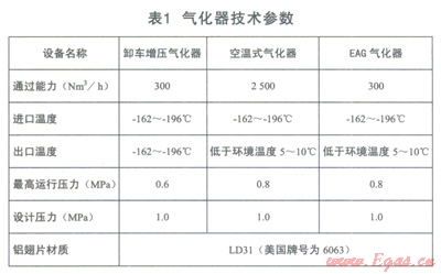 (1)卸車增壓氣化器、空溫式氣化器、EAG氣化器(技術(shù)參數(shù)見(jiàn)表l)。