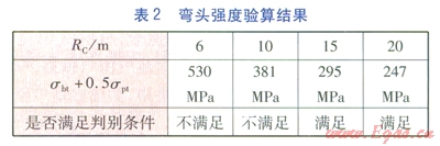 當(dāng)彎頭的計算曲率半徑RC分別取6、10、15、20m時,由式(9)~(17)得到的彎頭強度驗算結(jié)果見表2.充分考慮安全余量,彎頭的曲率半徑宜選取20m。