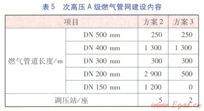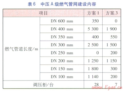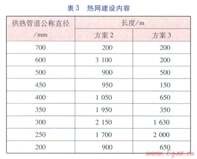方案l~3各分項(xiàng)工程建設(shè)內(nèi)容分別見表2~6。表3中的熱網(wǎng)指一級(jí)管網(wǎng),由于二級(jí)管網(wǎng)(包括分散式低溫燃?xì)忮仩t房至熱用戶的管網(wǎng))造價(jià)由用戶分?jǐn)?,因此不?jì)入熱網(wǎng)造價(jià)中。由表2~6可計(jì)算得出方案l~3的工程造價(jià)分別為35237.74×104、43004.35×104、41047.11×104元。