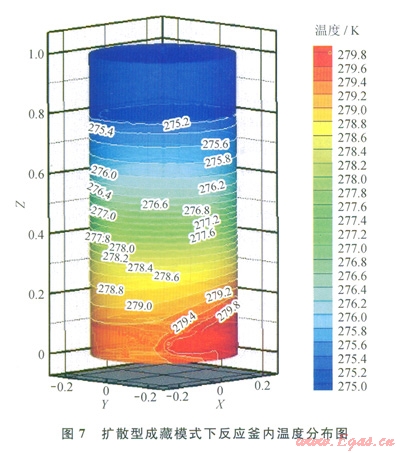 為了驗(yàn)證實(shí)驗(yàn)條件下通過(guò)U型加熱盤(pán)管是否能獲得類似自然條件下的地溫梯度,針對(duì)滲漏、擴(kuò)散兩種成藏方式,利用Fluent軟件對(duì)釜內(nèi)的溫度分布進(jìn)行了模擬計(jì)算,計(jì)算所用到的物性參數(shù)列于表3。流體紅275K下進(jìn)入反應(yīng)釜,經(jīng)過(guò)U型加熱盤(pán)管換熱后,流經(jīng)石英砂構(gòu)成的孔隙率為0.38的沉積層,由頂部的出口流出反應(yīng)釜。平衡后的溫度分布如圖6所示。