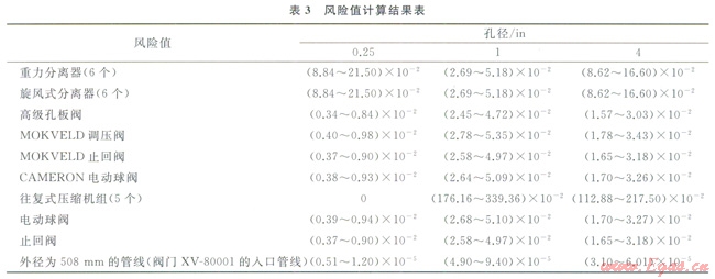 設(shè)備或管線的風(fēng)險(xiǎn)值為失效后果和失效概率的乘積(表3),設(shè)備風(fēng)險(xiǎn)要比管線風(fēng)險(xiǎn)大得多,而其中5套壓縮機(jī)組不論是失效后果還是失效概率都是最大的,其次是重力分離器和旋風(fēng)式分離器,以上所得風(fēng)險(xiǎn)數(shù)值為相對比較數(shù)值,不同站、同站不同區(qū)域之間沒有可比性。