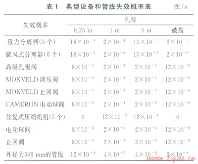 根據(jù)API 581標(biāo)準(zhǔn)以及榆林站1999—2012年的失效統(tǒng)計(jì)數(shù)據(jù)[22],考慮管理修正系數(shù),一線榆林壓氣站內(nèi)管線和典型沒備失效概率確定結(jié)果如表1所示。