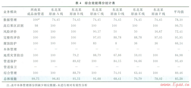 3)總體評價結(jié)果分析。本次評價中暫未考慮實施完整性管理的累積效果指標,在進行相對有效性評價時,將導致其效能偏低的結(jié)果。但隨著實施完整性管理長期累積效應的顯現(xiàn),待完整性管理應用成熟后(根據(jù)國外經(jīng)驗,一般實施2個循環(huán)后),根據(jù)多年累積數(shù)據(jù)進行投入產(chǎn)出綜合分析,其完整性管理實施的綜合效能將會增加。
