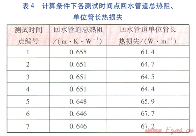 計算條件(指保溫層、保護層材料熱導率均取計算值時)下各測試時間點供回水管道總熱阻、單位管長熱損失分別見表3、4。