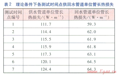 由已知數據可計算得附加熱阻為0.043m·K/W,將Ri+RPE+Rsoi定義為總熱阻。當保溫層材料熱導率取理論值(0.0275W·m-1·K-1),保護層材料熱導率取理論值(0.041W·m-1·K-1)時,總熱阻計算結果為0.693m·K/w。理論條件(指保溫層、保護層材料熱導率均取理論值時)下各測試時間點供回水管道單位管長熱損失見表2。