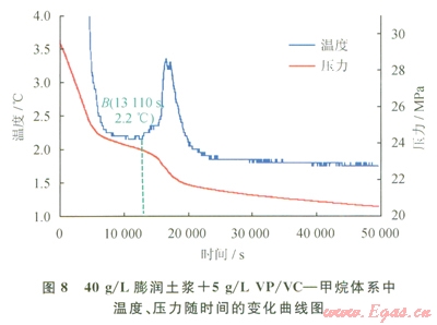 VP/VC屬于第二代天然氣水合物動力學抑制劑,由N-乙烯基吡咯烷酮和N-乙烯基己內酰胺共聚而成。圖7、8反映了加入VP/VC后膨潤土漿中水合物的生成過程。