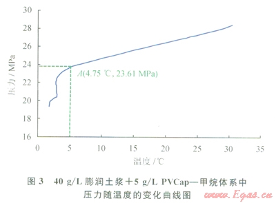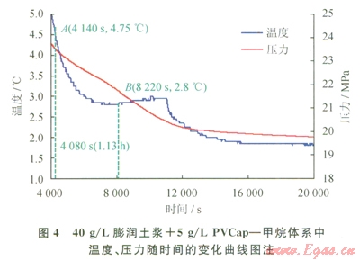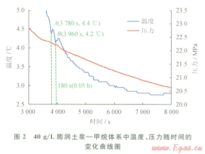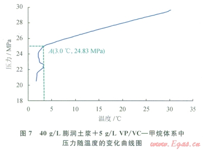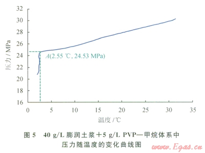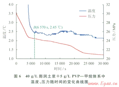 PVP作為第一代天然氣水合物動力學抑制劑的代表,近年來應用較多。圖5、6反映了加入PVP后膨潤土漿中水合物的生成過程。