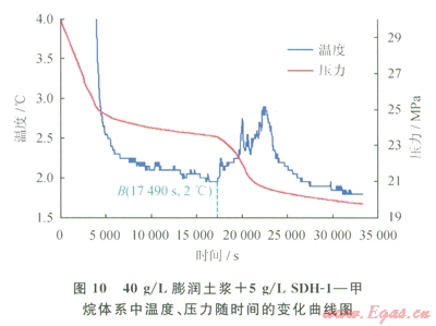 三元聚合物抑制劑SDH-l在VP/VC分子結構基礎上引入了強親水性基團,以增加聚合物的水溶性。圖9、10反映了加入SDH-1后膨潤土漿中水合物的生成過程。