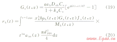 Talaghat等[13-6,45-46]在前人研究的基礎上通過小型循環(huán)管道中水合物的生成試驗,發(fā)展了水合物抑制劑體系下單組分氣體形成水合物的宏觀動力學生長模型,并通過進行一定的假設,建立了低劑量水合物抑制劑體系下水合物的生成模型,進而通過初始條件及邊界條件對模型進行了求解,在此基礎上針對管道中水合物的生成規(guī)律提出了含水合物抑制劑體系下水合物的生長速率模型和氣體消耗速率模型。