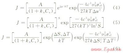 Kashchiev與Firoozabadi[28]通過分析晶體的成核過程,認為水合物的成核首先發(fā)生在氣液接觸面而不是液相的內部,基于此,提出了適用于單組分均相成核與三維非均相成核速率模型。研究了添加劑對水合物成核速率的影響,得到了與之相對應的模型(4~6)。由于該模型與實驗數(shù)據(jù)吻合較好,更加接近于水合物的真實成核過程,且方程的求解較簡單,因而被廣大學者所接受。即