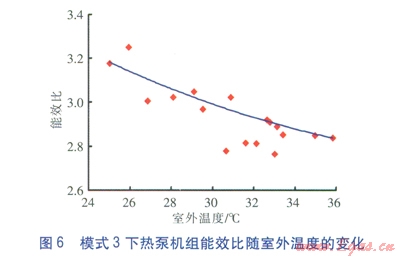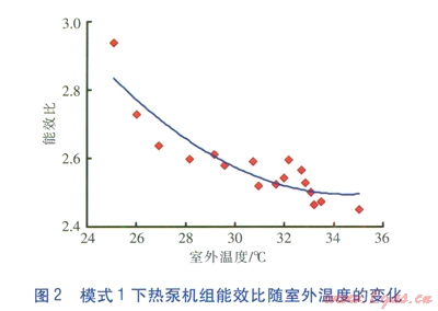 模式1下熱泵機組制冷性能系數(shù)隨室外溫度的變化見圖l,圖中紅色點為實測數(shù)據(jù)點,平滑曲線為擬合曲線:ICOP=0.0046q2-0.3224q2+8.2426,q為室外溫度(單位為℃)。由圖1可知,模式1下熱泵機組制冷性能系數(shù)隨室外溫度的升高而降低,且下降速率較快。這說明空氣源熱泵的性能易受室外溫度影響,當(dāng)室外溫度升高時,冷凝器的工作環(huán)境惡化,制冷劑甚至不能及時液化,直接導(dǎo)致熱泵機組的制冷性能系數(shù)下降。模式l下熱泵機組能效比隨室外溫度的變化見圖2,圖中紅色點為實測數(shù)據(jù)點,平滑曲線為擬合曲線:IEER=0.0038q2-0.2606q+7.0016。由圖1、2可知,模式1下熱泵機組能效比隨室外溫度的升高而降低,變化趨勢與制冷性能系數(shù)基本一致。