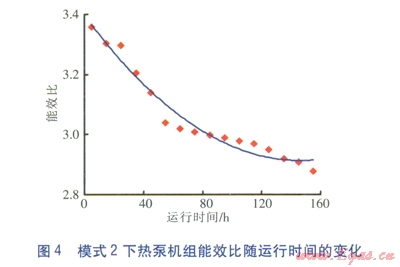 模式2下熱泵機組制冷性能系數(shù)隨運行時間的變化見圖3,圖中紅色點為實測數(shù)據(jù)點,平滑曲線為擬合曲線:ICOP=2×10-5t2-0.0065t+3.981,t為運行時間(單位為h)。由圖3可知,模式2下,雖然熱泵機組制冷性能系數(shù)隨運行時間的延長呈下降趨勢,且下降速率較快,但有趨于平穩(wěn)的趨勢。模式2下熱泵機組能效比隨運行時間的變化見圖4,圖中紅色點為實測數(shù)據(jù)點,平滑曲線為擬合曲線:IEER=2×10-5t2-0.0066t+3.3975。由圖3、4可知,模式2下熱泵機組能效比與制冷性能系數(shù)的變化趨勢基本一致。