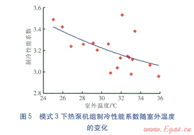 對于模式l,熱泵機組的制冷性能系數(shù)、能效比不高,且隨著室外溫度升高下降速率較快。對于模式2,熱泵機組的制冷性能系數(shù)、能效比較高,但隨著運行時間的延長下降速率較快。對于模式3,熱泵機組的制冷性能系數(shù)、能效比水平處于模式1與模式2之間,但隨著室外溫度的升高下降趨勢不明顯。因此,風(fēng)冷—水冷冷凝器聯(lián)合運行,對熱泵機組在長時間運行過程中保持較高性能有幫助。而且可平衡地埋管換熱器向土壤的釋熱、吸熱量,保持熱泵系統(tǒng)長期有效運行。