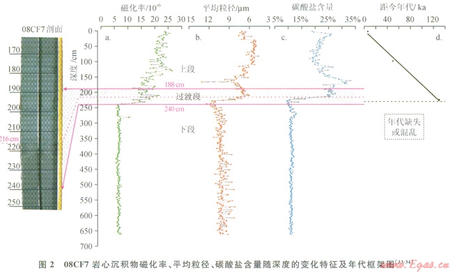 08CF7巖心在琴叁和取樣過(guò)程中未遭到人為破壞,且未見(jiàn)明顯生物擾動(dòng)痕跡,因此能較好地指示其原位沉積特征。巖心觀察發(fā)現(xiàn),沉積物白頂向下以216cm處為界,上部為灰黑色,下部為淺黑色,交界面呈相互穿透狀,整段巖心的沉積物類型均為黏土質(zhì)粉砂。筆者在前期的研究中已對(duì)巖心沉積物進(jìn)行粒度、磁化率和碳酸鹽含量測(cè)定和分析[34-35],將結(jié)果進(jìn)行綜合對(duì)比和分析,發(fā)現(xiàn)這3項(xiàng)指標(biāo)均呈現(xiàn)出相似的變化趨勢(shì),可分為3段:①0~188cm段,各項(xiàng)指標(biāo)變化較大,以磁化率值高,沉積物粒度小及碳酸鹽含量高為特征;②188~240cm段,為各項(xiàng)指標(biāo)和沉積物巖性變化的過(guò)渡段;③240cm以下,各項(xiàng)指標(biāo)呈現(xiàn)均一性變化,相對(duì)以磁化率值低,沉積物較粗及碳酸鹽含量低為特征(圖2)。