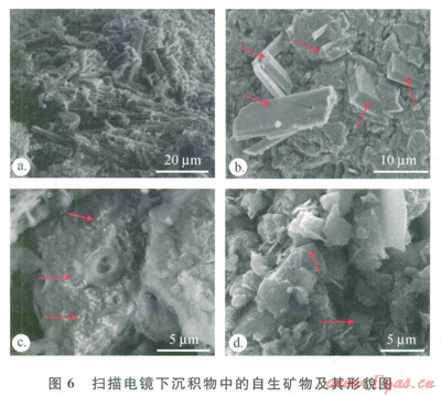自生碳酸鹽礦物主要呈細(xì)粒狀發(fā)育在沉積物中,在掃描電子顯微鏡下,原樣中的文石呈針狀生長(zhǎng)在沉積物中(圖6-a),沒(méi)有發(fā)現(xiàn)沿孔隙生長(zhǎng)的簇狀文石,而在細(xì)粒組分中,文石呈碎屑狀出現(xiàn)(圖6-b)。白云石呈微晶狀發(fā)育在黏土團(tuán)塊中(圖6-c),周圍有l0mm的滲漏微孔。在原樣中沒(méi)有觀察到方解石顆粒,但在細(xì)粒組分中可觀察到方解石呈棱形體零星地散布在細(xì)粒組分中(圖6-d),顆粒一般為2~15mm。這些觀察表明,沉積物中發(fā)育自生碳酸鹽礦物,但其顆粒細(xì)小且分散在沉積物中,未發(fā)育成塊狀碳酸鹽巖。