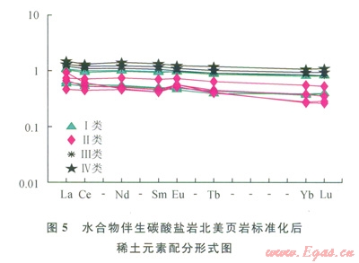 比值主要集中在1.04~1.30,反映了稀土元素中的輕稀土元素、重稀土元素的富集程度和分餾程度不強(表4)。4類碳酸鹽巖樣品中雖然輕稀土、重稀土分異不強,但呈現(xiàn)Eu異常;其中第Ⅰ類和第Ⅱ類碳酸鹽巖樣品中Eu表現(xiàn)一定程度的正異常特征(其平均Eu分別約為0.66和0.70),而第Ⅲ、Ⅳ類碳酸鹽巖樣品中Eu表現(xiàn)為負異常(其平均Eu分別約為l.18和1.38);第Ⅱ類碳酸鹽巖樣品中重稀土(åHREE)平均含量最低(約為21.67mg/g),而第Ⅰ、Ⅲ、Ⅳ類碳酸鹽巖樣品中重稀土(åHREE)平均值分別為30.45mg/g、42.65mg/g、48.90mg/g。