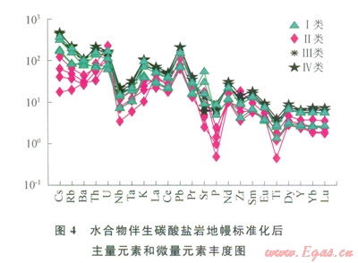 巖石化學(xué)蝕變指數(shù)(CIA)——CIA指數(shù)=[Al2O3/(A12O3+CaO+Na2O+K2O)]×100,表達了Al2O3(含鋁黏土礦物)、(CaO+Na2O)(斜長石)和K2O(鉀長石)含量之間的變化關(guān)系,反映出沉積烴源巖特征[27]。該區(qū)4類碳酸鹽巖樣品中CIA指數(shù)分別約為32、36、44、72,第Ⅰ類和第Ⅱ類碳酸鹽巖中混入的碎屑部分程度最弱,因為這個原因,第Ⅱ類碳酸鹽巖樣品中稀土元素含量最低(其平均約為l03.61mg/g,而第Ⅰ、Ⅲ、Ⅳ類碳酸鹽巖樣品中稀土元素含量分別約為137.48mg/g、197.83mg/g、230.07mg/g),其樣品中主量元素和微量元素含量也相對最低(表3、4),即表明黏土礦物對該類碳酸鹽巖形成過程中的貢獻最小。