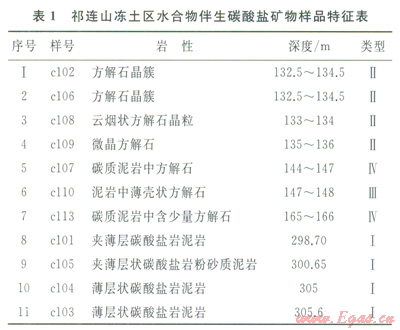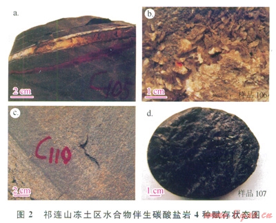 實際中,祁連山凍土區(qū)與水合物伴生的第Ⅰ、Ⅲ、Ⅳ類碳酸鹽巖在鉆孔中產(chǎn)出深度在144~305m,主要屬江倉組,為l套淺湖—半深湖環(huán)境的細碎屑泥巖、粉砂巖等。其中,第Ⅰ類碳酸鹽巖旱白色薄層狀夾層產(chǎn)出在泥巖層中,厚度介于3~5cm(圖2-a),第Ⅲ類碳酸鹽巖呈深灰色薄殼狀產(chǎn)出在泥巖微裂隙中,厚度一般小于1mm(圖2-c),第Ⅳ類碳酸鹽巖呈微細浸染狀賦存于炭質(zhì)(鈣質(zhì))泥巖等中(圖2-d),該類碳酸鹽巖所在巖層新鮮面上肉眼可見白色絲狀非晶質(zhì),點滴鹽酸時出現(xiàn)強烈冒泡現(xiàn)象。