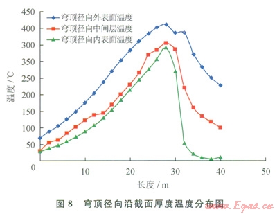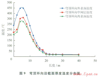穹頂混凝土的外表面溫度無(wú)論是徑向還是環(huán)向,最高溫度均在450℃左右。內(nèi)外表面溫度相差l00℃左右,將產(chǎn)生較大的溫度應(yīng)力(圖8、9)。