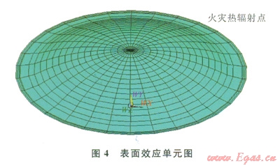 其中承壓環(huán)及襯板用shelll31單元建立、其他部分可用實(shí)體單元solid70。有限元模型求解的是連續(xù)體問(wèn)題,但在此模型中,安全閥的位置離穹頂約16m,是非連續(xù)孤立的節(jié)點(diǎn)。為了能讓安全閥的熱輻射能傳遞到穹頂。必須借助一類(lèi)特殊的單元即表面效應(yīng)單元,實(shí)現(xiàn)孤立火災(zāi)點(diǎn)和儲(chǔ)罐各個(gè)部分的熱輻射。