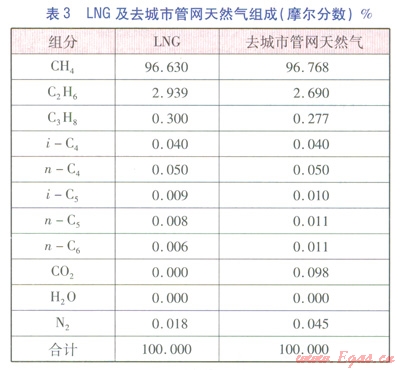 調(diào)試流程直至收斂,得到計(jì)算結(jié)果見(jiàn)表2,LNG及去城市管網(wǎng)天然氣組成見(jiàn)表3。