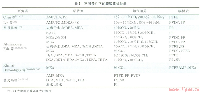此外,由于單一吸收劑不能完全滿足高再生性能與高吸收速率,研究者們?cè)诨旌衔談┑奶剿髦腥〉昧溯^大進(jìn)展。常用的活化添加劑有醇胺、烯胺以及脂肪胺等。Wongrong等[58]發(fā)現(xiàn)在MEA中添加甘氨酸鈉溶液吸收效果有較大改善。Chen等[59]考察了6種不同配比的MEA/MDEA和PG/MDEA混合液,發(fā)現(xiàn)當(dāng)MDEA在混合液中比例為3:2時(shí),脫除效率可達(dá)99%,并且反應(yīng)更持久。楊波等[60]在氨基酸鉀中加入活化劑哌嗪(PZ)后,捕集濃度為15%的CO2模擬煙氣,CO2脫除率得到不斷提升。晏水平[53]通過大量實(shí)驗(yàn)研究了不同配比混合吸收劑的吸收與再生性能,發(fā)現(xiàn)在三級(jí)胺溶液中添加中等含量活化劑時(shí)性能最佳。表2總結(jié)了部分國內(nèi)外學(xué)者進(jìn)行膜吸收試驗(yàn)的條件及參數(shù)。綜上所述,MEA/TEA、PZ/TEA、MEA/MDEA、PZ/MDEA、MEA/AMP、PZ/AMP和PZ/DEA等混合吸收劑體現(xiàn)了良好的綜合性能。因此,采用具有高CO2吸收和再生性能的吸收劑組成的混合吸收劑理論上能獲得較好的CO2吸收與再生綜合性能。所以,在規(guī)?;瘧?yīng)用中,應(yīng)當(dāng)根據(jù)實(shí)際情況進(jìn)行適當(dāng)?shù)蛘?,確定最優(yōu)的活化劑種類與濃度,達(dá)到最佳吸收效果,找到一種高效吸收與再生的吸收劑。