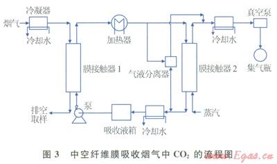 為研究不同來源原料氣下膜吸收法的吸收與解吸特性,比較傳統(tǒng)與非傳統(tǒng)再生方法的差異,改善當(dāng)前解吸能耗大、能源浪費(fèi)等問題,筆者提出一種采用中空纖維膜接觸器分離煙氣中CO2的方法及系統(tǒng)(圖3),試驗(yàn)流程主要包括煙氣冷凝、膜吸收以及CO2解吸再生3大部分。燃煤尾氣經(jīng)煙氣冷凝器降溫后,送入中空纖維膜接觸器1,與吸收劑充分反應(yīng),其中CO2被吸收,吸收富液經(jīng)過加熱器,在中空纖維膜接觸器2中減壓再生或氣液分離器中分離出CO2,最后通過真空泵調(diào)節(jié)真空度,收集高濃度CO2氣體。而再生后的吸收貧液則經(jīng)過冷凝器降溫返回吸收液箱,進(jìn)行連續(xù)循環(huán)流動(dòng)試驗(yàn)。同時(shí)此方法也可以采用模擬煙氣進(jìn)行試驗(yàn),與實(shí)際煙氣對(duì)比研究。該系統(tǒng)首次對(duì)煤、天然氣、生物質(zhì)產(chǎn)氣鍋爐實(shí)際煙氣進(jìn)行排放處理,同時(shí)也可對(duì)周期性循環(huán)進(jìn)行單根、串聯(lián)與并聯(lián)膜組件吸收試驗(yàn),對(duì)比CO2傳統(tǒng)與非傳統(tǒng)再生試驗(yàn),研究水蒸氣、N2等不同吹掃氣氛下的CO2回收特性以及考察真空度變化對(duì)CO2純度的影響[77]。