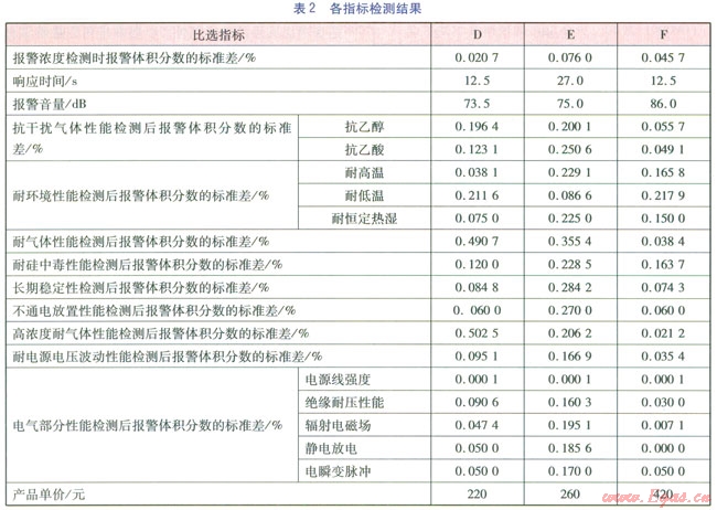 對檢測數(shù)據(jù)進行初步處理,變換成具有可比性的數(shù)據(jù)。由于各檢測項目中除報警音量、響應時間、產(chǎn)品單價為直接測得值可以直接比較外,其他項目檢測結果均表現(xiàn)為一組產(chǎn)品報警濃度檢測時的報警體積分數(shù)值,而報警體積分數(shù)值并非越大越好或越小越好,而是要求一組數(shù)據(jù)與產(chǎn)品設定的報警體積分數(shù)值偏離得越小越好,因此把各組數(shù)據(jù)轉化為用標準差表示的數(shù)據(jù),見表2。