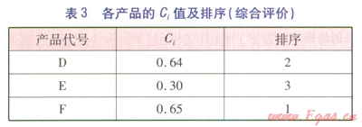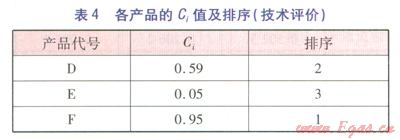 若不考慮經(jīng)濟性的影響,單從技術方面對產(chǎn)品進行評價,按同樣方法進行計算,得到各產(chǎn)品的Ci值及排序見表4??梢姡夹g排序與綜合評價排序相同,但是,各產(chǎn)品的技術優(yōu)劣勢很明確,F產(chǎn)品在技術上明顯優(yōu)于D產(chǎn)品。