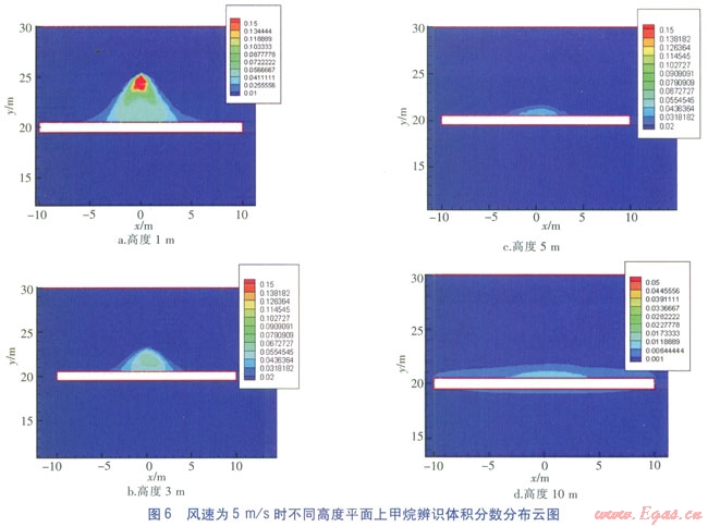 不同風速下yOz平面上甲烷辨識體積分數(shù)分布云圖(視線方向為x軸負方向)見圖2~4。由圖2可知,當風速為1m/s時,障礙物迎風面危險體積分數(shù)范圍分布在7~10m高度范圍內(nèi)。當風速為5m/s時,分布在0~5m高度范圍內(nèi)。當風速為l0m/s時,分布在0~3m高度范圍內(nèi)。