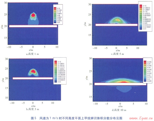 由圖6可知,當風速增大至5m/s時,在z=1m平面上,障礙物近壁面甲烷辨識體積分數(shù)聚積寬度達到l0m,危險體積分數(shù)范圍分布高度比風速為1m/s時有所降低,約在5m以下。雖然在z=10m處仍可觀測到甲烷辨識體積分數(shù),但不足以構成威脅。