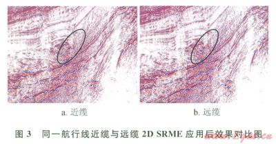 首先與傳統(tǒng)的2D SRME進(jìn)行比較。圖3是同一航行線近遠(yuǎn)纜使用2D SRME后的疊加,可以看到近纜2D SRME效果較好,而遠(yuǎn)纜效果則較差。這種現(xiàn)象可以從2D SRME的理論基礎(chǔ)來(lái)解釋,2D SRME技術(shù)是平面波褶積模型,它沒(méi)有考慮到多次波場(chǎng)的三維空間傳播,只有當(dāng)震源與拖纜在一條航行線上時(shí),2D SRME才會(huì)有較好的效果?,F(xiàn)在的采集方式多為多纜采集,很難滿足2D SRME理論要求。3D SRME克服了2D SRME的技術(shù)缺陷,考慮了多次波場(chǎng)的三維空間傳播,一方面能模擬更多的多次波場(chǎng)(如繞射多次);另一方面,其模擬的多次波在空間位置更準(zhǔn)確,對(duì)于后續(xù)的匹配相減更重要。