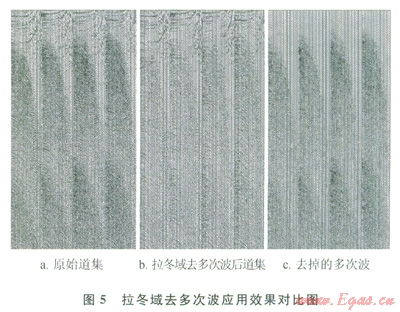 應(yīng)用3D SRME后,剩余了較多的長(zhǎng)周期多次波,3D SRME對(duì)該類型的多次波無(wú)能為力。拉冬域去多次波技術(shù)是應(yīng)用較早的很成熟的壓制該類型多次波的技術(shù),放在3D SRME后的CMP道集上處理。值得一提的是,拉冬域去多次波技術(shù)涉及道集在拉冬域的正反變換,很顯然,應(yīng)用3D SRME后的道集更適合于這種正反變換,可以減少高頻的海底相關(guān)多次在正反變換中的假頻現(xiàn)象。