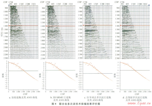 為了驗(yàn)證該聯(lián)合去多次波技術(shù)的保幅性,在每一個(gè)處理階段都加入了AVO分析。從圖8可以看到(拾取時(shí)間均為1400ms):在每一個(gè)多次波處理階段,其相對(duì)振幅是有變化的,而振幅隨偏移距的變化趨勢(shì)大體一致。通過(guò)這種半定量的評(píng)價(jià)方式,認(rèn)為該套聯(lián)合去多次波技術(shù)是保幅的,能夠滿足后續(xù)AVO分析和疊前反演的需求。