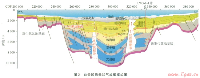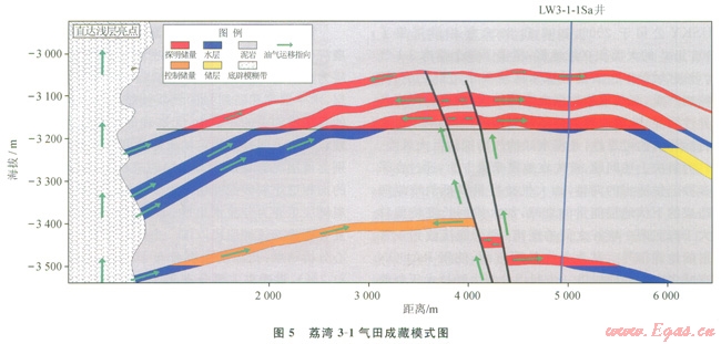 總體說(shuō)來(lái),荔灣3-1構(gòu)造是一個(gè)具有古基底高背景的晚漸新世淺海陸架三角洲體系、早中新世富砂深水扇體系下的斷裂—背斜—地層復(fù)合圈閉。其天然氣成藏聚集是近源晚期階段性累積成藏的產(chǎn)物。在中中新世以后(距今8~0Ma),主要來(lái)自白云凹陷主洼東部斜坡帶恩平組(現(xiàn)埋深在4600~6000m)有效烴源巖生成的天然氣,通過(guò)斷層和流體底辟向上進(jìn)行垂向運(yùn)移,然后沿區(qū)域砂體+不整合面+構(gòu)造脊綜合輸導(dǎo)體系進(jìn)行側(cè)向運(yùn)移,進(jìn)入荔灣3-1這個(gè)大型的以披覆背斜為主的斷裂背斜地層復(fù)合型圈閉,在上覆巨厚的新近系海相泥巖的封蓋下,形成荔灣3-1大氣田(圖5)。