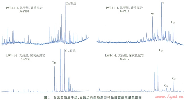 烴源巖樣品有機(jī)地球化學(xué)分析表明(表1、圖l),恩平組淺湖相、沼澤相烴源巖殘余有機(jī)碳含量(TOC)變化大(1.12%~56.18%),生烴潛力指數(shù)(Pg)較高(0.56~97.47mg/g);氫指數(shù)(HI)較低,介于50~300mg/g,有機(jī)質(zhì)類(lèi)型為偏腐殖型干酪根;Pr/Ph為1.6~5.9,沉積環(huán)境變化大;C29規(guī)則甾烷優(yōu)勢(shì),貧4-甲基甾烷系列;富含陸源三萜類(lèi)生物標(biāo)志物,如W、T樹(shù)脂化合物含量高,奧利烷含量較低—中等。文昌組湖相烴源巖殘余有機(jī)碳含量適中(1.00%~2.50%),生烴潛力指數(shù)較高(8.18~l3.64mg/g);氫指數(shù)較高,介于446~566mg/g,有機(jī)質(zhì)類(lèi)型為偏腐泥型干酪根;Pr/Ph為1.4~1.7,沉積環(huán)境為還原環(huán)境;與盆地北部珠一地區(qū)富生烴凹陷文昌組烴源巖特征不一樣,白云凹陷文昌組來(lái)源于藻類(lèi)的C27規(guī)則甾烷含量較高,而貧4-甲基甾烷系列,推測(cè)當(dāng)時(shí)可能因處于不同的湖泊環(huán)境,其水生生物的種類(lèi)也不同而導(dǎo)致;貧陸源三萜類(lèi)生物標(biāo)志物,如W、T樹(shù)脂化合物和奧利烷含量低(或難于檢測(cè))。烴源巖有機(jī)質(zhì)及生態(tài)組分中富含無(wú)定型和浮游藻類(lèi)。