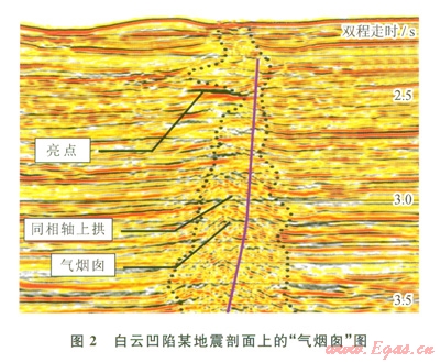 底辟構(gòu)造由地球深部物質(zhì)上拱或刺穿到淺部產(chǎn)生。在含油氣盆地中,流體底辟構(gòu)造是烴源巖垂向幕式排烴和油氣幕式成藏的一種特殊類(lèi)型。在白云凹陷的地震剖面上發(fā)現(xiàn)了多個(gè)流體底辟帶,底辟的頂部到達(dá)淺部地層,最高處接近海底。流體底辟作用產(chǎn)生的“氣煙囪”呈直立、上小下大的煙囪狀,局部橫向擴(kuò)張呈囊狀、花狀,地震反射同相軸被明顯中斷,自身內(nèi)部反射較雜亂、模糊,甚至為空白反射(模糊帶),局部見(jiàn)同相軸上拱或下拉現(xiàn)象(圖2)。