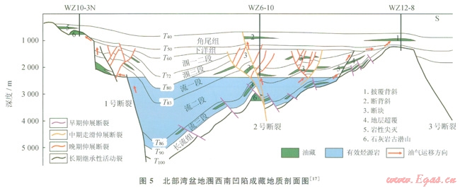 北部灣盆地處于南海北部大陸架西段,盆地經(jīng)歷古近紀(jì)斷陷、新近紀(jì)與第四紀(jì)坳陷、新構(gòu)造活動(dòng)階段,二級(jí)構(gòu)造單元呈三坳兩隆,即北部坳陷、企西隆起、中部坳陷、南部隆起和南部坳陷,三級(jí)構(gòu)造單元包括l0多個(gè)凹陷和凸起[2,14](圖4、5)。上述凹陷被次凸等進(jìn)一步分隔成多個(gè)洼陷,多數(shù)洼陷呈“肉(古近系)厚皮(新近系)薄”的地層特征,洼陷是油氣生成的基本單元。烴源巖為始新統(tǒng)流沙港組中深湖相泥巖,其有機(jī)質(zhì)類型以腐泥型和偏腐泥混合型為主,有機(jī)質(zhì)豐度高[3],屬于好烴源巖,比較單一,但在各洼陷分布差異甚大。北部灣盆地地溫梯度較高,為32.9±7.1℃/km,大地?zé)崃髦禐?span lang="EN-US">65.7±8.9mW/m2,屬于熱盆。流二段烴源巖R。介于0.2%~l.2%,熱演化程度為低熟成熟階段,以生油為主[2-3]。因此受源熱共控,北部灣盆地部分凹陷成為富油凹陷,已證實(shí)的富油凹陷有潿西南凹陷(由3個(gè)洼陷組成)、福山凹陷和烏石凹陷東洼??v向上石油分布于石炭系古潛山組合、古新統(tǒng)長(zhǎng)流組—始新統(tǒng)流沙港組下組合、漸新統(tǒng)潿洲組中組合、新近系下洋組—角尾組上組合。北部灣盆地自新近紀(jì)以來(lái),絕大多數(shù)區(qū)域新構(gòu)造運(yùn)動(dòng)微弱[2,14],石油近距離或源內(nèi)聚集,目前北部灣盆地發(fā)現(xiàn)的石油主要集中在中、下組合。
