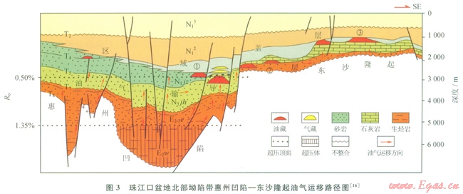 珠江口盆地北部坳陷帶(圖2、3)處于南海北部大陸邊緣陸架上,盆地基底是燕山期島弧帶,盆地形成經(jīng)歷古近紀(jì)斷陷、新近紀(jì)坳陷與新構(gòu)造期3個(gè)階段。其中始新統(tǒng)文昌組沉積末期盆地受到強(qiáng)烈改造,地層遭受較大規(guī)模剝蝕。盆地二級(jí)構(gòu)造單元有珠一坳陷和珠三坳陷等。三級(jí)構(gòu)造單元包括10多個(gè)凹陷和凸起。凹陷是潛在的生烴單元,但都比較破碎,多數(shù)凹陷被次級(jí)凸起進(jìn)一步分隔成多個(gè)洼陷。洼陷才是最基本的生烴單元,多數(shù)洼陷呈“肉(古近系)厚皮(新近系)薄”特征。烴源巖為始新統(tǒng)文昌組中深湖相泥巖、漸新統(tǒng)恩平組湖沼相煤系地層[3],部分凹陷可能殘留有中生代海相—海陸過(guò)渡相烴源巖。該區(qū)域地溫梯度及大地?zé)崃髦捣謩e為36.6±6.0℃/km和66.1±8mW/m2[15],屬于熱盆。始新統(tǒng)文昌組中深湖相泥巖烴源巖有機(jī)碳含量介于0.50%~4.88%,平均為1.22%,以偏腐泥混合型干酪根為主,埋藏深度處在生油窗范圍,主要生油,是主力生油巖;恩平組因埋藏淺、熱演化程度低在珠一坳陷生成少量石油,在珠三坳陷生成部分天然氣。因此主力烴源巖為始新統(tǒng)文昌組,比較單一,決定了以油為主的縱向分布特征[3]。已發(fā)現(xiàn)的生油洼陷有惠州26洼、陸豐l3洼、番禺4洼、恩平l7洼、珠三坳陷文昌B洼等??v向上石油分布在基底組合、始新統(tǒng)文昌組—恩平組下組合、漸新統(tǒng)珠海組—下中新統(tǒng)珠江組中組合、中上新統(tǒng)粵海組—萬(wàn)山組上組合。珠江口盆地北部新構(gòu)造活動(dòng)劇烈,石油晚期運(yùn)移活躍,目前發(fā)現(xiàn)的石油主要集中在中組合,其他組合是下一步的油氣勘探方向。