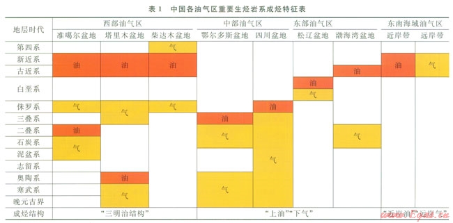 中國(guó)不同盆地群的盆地在縱向上有不同的油氣(包括常規(guī)油氣和非常規(guī)油氣)成烴樣式(表1)。如鄂爾多斯盆地油氣田呈“下氣(古生界)上油(三疊系—侏羅系)”格局、松遼盆地油氣田呈“下氣(下白堊統(tǒng))上油(上白堊統(tǒng))”格局,其他盆地也呈現(xiàn)出油氣田在空間上有序分布的特征(表1)。但以油氣區(qū)(盆地群)為單元,進(jìn)而討論中國(guó)海陸總體油氣田分布規(guī)律的研究并不多見(jiàn),而進(jìn)一步歸納全國(guó)油氣田空間分布模式、揭示其成因,準(zhǔn)確把握油氣田分布規(guī)律,對(duì)于指導(dǎo)油氣領(lǐng)域勘探有著極其重要的意義。
