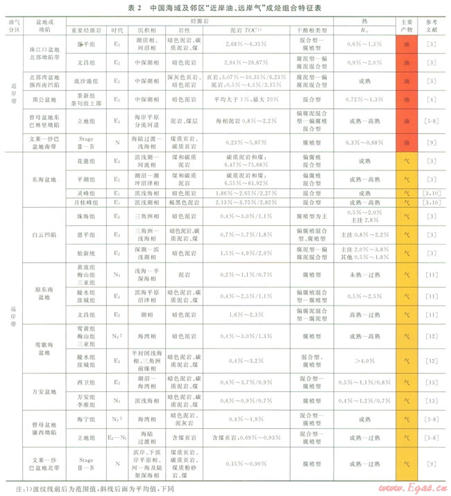 中國(guó)東南沿海油氣區(qū)指東海海域和南海海域油氣區(qū)。油氣區(qū)內(nèi)盆地的基底是印支、燕山期造山帶,盆地屬于邊緣海盆地,結(jié)構(gòu)呈斷陷—坳陷,充填的主要地層為新生界(局部有中生代殘留盆地)。盆地的烴源巖時(shí)代相對(duì)單一,主要發(fā)育一套古近紀(jì)—新近紀(jì)地層[2-13],在不同盆地生油氣性質(zhì)不同,從油氣田分布看,可以分成近岸原油帶和遠(yuǎn)岸天然氣帶(圖1、表2)。